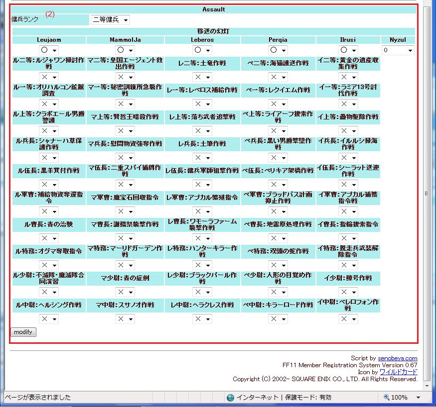 | (1) | ファランクスII (赤魔道士2) | ファランクスII (赤魔道士2) | ファランクスII (赤魔道士2)にいくらメリットポイントを使ったか | Phalanx II(Red Mage Group 2) | How many number of upgrades on Phalanx II(Red Mage Group 2) |